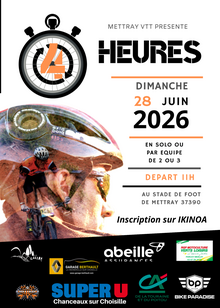 4h VTT de Mettray 2026Le 28 juin 2026 à METTRAY (37) VTTC'est une course VTT pendant 4H en relais ou en solo sur un circuit de 5/6 kms 31 années d'existence Voir photos sur facebook de mettrayvtt ou site internet Rdv au terrain de BMX de Mettray Merci de vous inscrire le plus tôt possible afin de préparer le terrain de jeu, des... | Inscription |