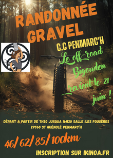 Gravel Bigoud 2026Le 21 juin 2026 à PENMARC'H (29) GravelGravel bigoud 2026 quatre circuits Gravel sont proposé cette année : 46/62/85/100km avec respectivement 110/160/350/500 de D+ il s'agit de circuits off-road composé de 80% de chemin et 20% de route de campagne, au départ de la salle ile fougère à st guénolé/... | Inscription | |