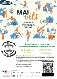Mai à vélo - GrosbliederstroffLe 9 mai 2026 à GROSBLIEDERSTROFF (57) CyclotourismeUn petit tour à la campagne - Randonnée familiale accompagnée (25-30 km). Cette balade familiale à vélo suivra les pistes cyclables et routes à faible densité de circulation. Les enfants accompagnés d’un adulte sont les bienvenus. Il vous sera également proposé un parcours de... | Inscription | |