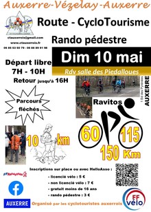 Rando Cyclo et pédestre Auxerre-Vézelay-Auxerre du 10/05/26Le 10 mai 2026 à AUXERRE (89) Cyclotourisme Les CTA organisent leur rando avec les modifications suivantes: elle se déroulera le 10 mai 2026 au départ de la salle des Piedalloues (1 bd des Pyrénées Auxerre). Un parcours rando pédestre d'environ 10 km sera proposé. Tous les parcours sont... | Inscription | |
