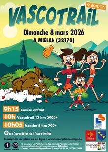 VascoTrailLe 8 mars 2026 à MIÉLAN (32) TrailRetrouvez nous le Dimanche 8 Mars 2026 pour la 5e édition du Vascotrail à Miélan (32170). 9h15 : Course enfants 10h : Trail 13 km - 390D+ 10h05 : Marche 8 km - 79D+ Ravitaillement, vestiaires, douches et Gas'croute à l'arrivée. Votre participation... | Inscription | |