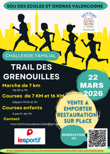 Trail des GrenouillesLe 22 mars 2026 à VALENCOGNE (38) Trail1ère édition. Le sou des écoles de Valencogne St Ondras vous propose de venez découvrir les sentiers de Valencogne. Venez faire un challenge familial, chacun peut trouver sa course. Lieu de rendez vous : salle des fêtes de Valencogne. Au... | Inscription | |