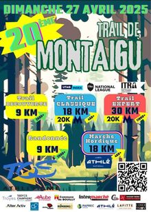 Trail de MontaiguLe 26 avril 2026 à BOUILLY (10) Trail Un Trail Expert de 30 km D+1180 m - Un Trail Classique de 18 km D+460 m - Une épreuve de Marche Nordique label national et qualificative au Championnat de France de 18km D+460 m -Une épreuve de Marche Nordique OPEN de 9km ... | Inscription |