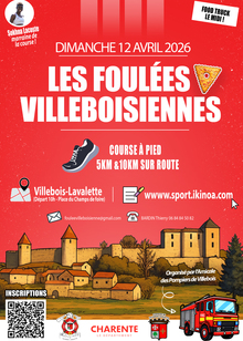 Foulées VilleboisiennesLe 12 avril 2026 à VILLEBOIS-LAVALETTE (16) Course sur routeLes foulées Villeboisiennes proposent deux courses chronométrées sur routes sécurisées. Une course de 5 Km. Une course de 10 Km (deux boucles de 5 Km). Départ 10h00 du champ de foire. Un cadeau sera offert à chaque coureur au moment du retrait des dossards. Des douches seront à disposition... | Inscription |