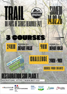trail du pays de serresLe 14 février 2026 à BEAUVILLE 47470 (47) TrailExigeant, beau, atypique, nous vous présentons le Trail du Pays de Serres à Beauville en Lot et Garonne. Nous vous proposons deux formats de course pour que chacun puisse en profiter en fonction de son niveau et de ses objectifs (24Km/9Km). Pour cette année 2026,... | Inscription | |