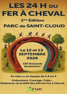 Les 24h du Fer à ChevalDu 12 au 13 septembre 2026 à SAINT-CLOUD (92) TrailLes 24h du Fer à Cheval est une course d’endurance sportive et originale, organisée par XRUN au Domaine National de Saint-Cloud, les 12 et 13 septembre 2026. Les participants parcourent une boucle de 400 mètres avec 30 mètres de dénivelé, pour effectuer le plus grand nombre de tours... | Inscription | |