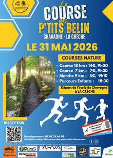 La Course des P'tits Belin 2026Le 31 mai 2026 à LA CRECHE (79) Course à pied - RandonnéeLe Dimanche 31 mai 2026 aura lieu la 3ème édition de La Course des P'tits Belin à Chavagné sur la commune de LA CRÈCHE. La Course des P'tits Belin est une manifestation sportive organisée par l'association Les P'tits Belin, un groupe de... | Inscription | |