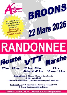 Randonnée VTT, cyclotourisme et pédestre de l'Amicale Cyclotourisme BroonaiseLe 22 mars 2026 à BROONS (22) RandonnéeLe Dimanche 23 Mars 2025, l’Amicale Cyclotourisme Broonaise organise une randonnée route, VTT et marche. Ce traditionnel rendez-vous annuel de cyclotourisme sur les routes et chemins des environs du Pays de Du Guesclin est une excellente mise en jambe pour préparer les... | Inscription | |