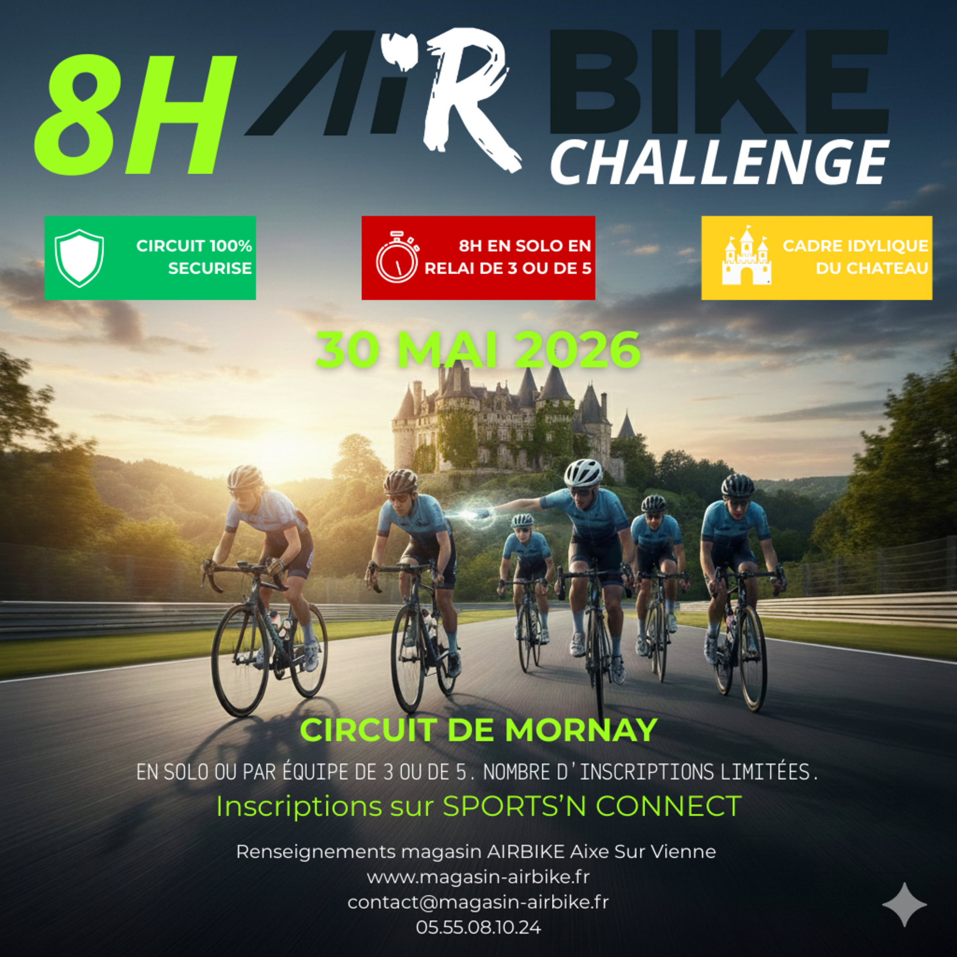 Le samedi 30 mai 2026, le mythique Circuit de Mornay (23) devient votre Colisée. 8 heures d'endurance en solo ou en équipe en relai, un asphalte parfait et une sécurité totale au pied d'un château historique. Un spectacle visuel avec animation et professionnels de l'image.