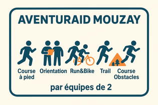 Epreuve combinée : course à pied, orientation, run&bike, trail, course à obstaclesEpreuve combinée nature par équipe de 2. Enchainement d’un prologue course à pied de 1800m, d’une course d’orientation de 10 postes sans ordre imposé (environ 2000m), d’un run and bike de 5600m, d’un trail de 4200m et d’une course à obstacles de 1800m. Le tout sur l’Espace Fernand Pinon 37600 MOUZAY, totalement fermé à la circulation.Tarif Âge Licencié Non-licencié Homme Femme Montant Tarif normal 16-85 ans 12,00 € par équipe Les inscriptions seront ouvertes du 01/01/2026 au 07/06/2026