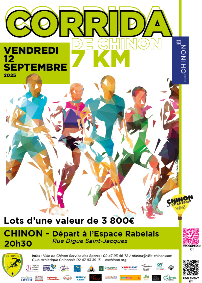 Course à piedCette course se déroule dans le centre ville de Chinon. Le départ et l'arrivée se situe à l'espace Rabelais (proche du lycée) de Chinon. Après une petite boucle dans le faubourg, vous traverserez le pont de Chinon avec une vue sur le château médiéval. Vous emprunterez les petites rues et passerez dans le coeur de la ville. Pour finir, vous reprenez le pont et faites un petit passage dans le faubourg pour accéder à l'arrivée.Tarif Âge Licencié Non-licencié Montant Tarif Plus de 16 ans 9,00 € - Le 12/09/2025 de 19h30 à 20h00