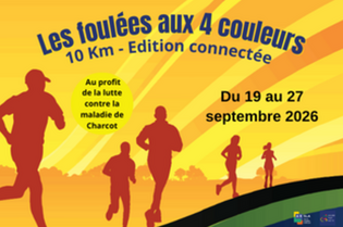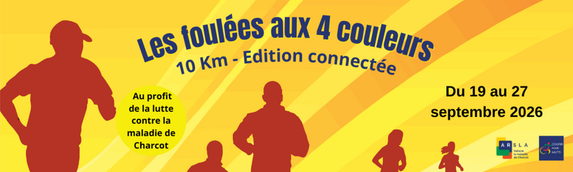 Les Foulées aux 4 couleurs – 10 km – Édition connectée sont nées d’un élan de solidarité pour soutenir les personnes touchées par la Sclérose Latérale Amyotrophique (SLA), aussi appelée maladie de Charcot. Cette maladie neurodégénérative rare provoque la dégénérescence progressive des neurones moteurs, rendant de plus en plus difficiles les mouvements volontaires. Au fil du temps, marcher, écrire, parler, avaler ou respirer devient impossible, tandis que les capacités intellectuelles demeurent intactes.