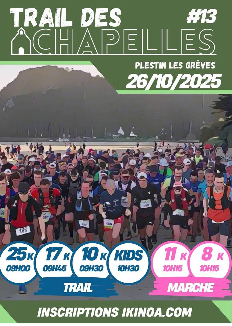 TrailLa boucle démarre de la baie de ST EFFLAM puis direction le grand rocher. Vous contournerez Plestin par les chemins de campagnes pour rejoindre la vallée du Douron et Toul An Hery. Le retour se fait par le sentier des douaniers avec une vue magnifique sur la baie de LOCQUIREC. Circuit vallonné avec quelques portions techniques (D+ 500m)Parcours chronométré - Certificat de non contre indication de la course à pied en compétition obligatoire ou PPS valide2 ravitaillements sur le parcours et 1 ravitaillement à l'arrivée1 souvenir pour chaque participantTarif Âge Licencié Non-licencié Dates d'inscription Montant Tarif Plus de 18 ans Du 26/07/2025 17,00 € - Le 26/10/2025 de 09h45 à 13h00